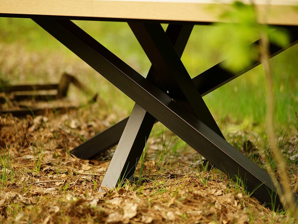 Blat stołu wykonany jest z płyty laminowanej w której są widoczne elementy struktury drewna: słoje i sęki, a jego powierzchnia jest szczotkowana. Całość tworzy ciekawy kontrast, pomiędzy chłodną podstawą i ciepłym kolorem blatu. W naszej ofercie posiadamy ponad 12 kolorów blatu.