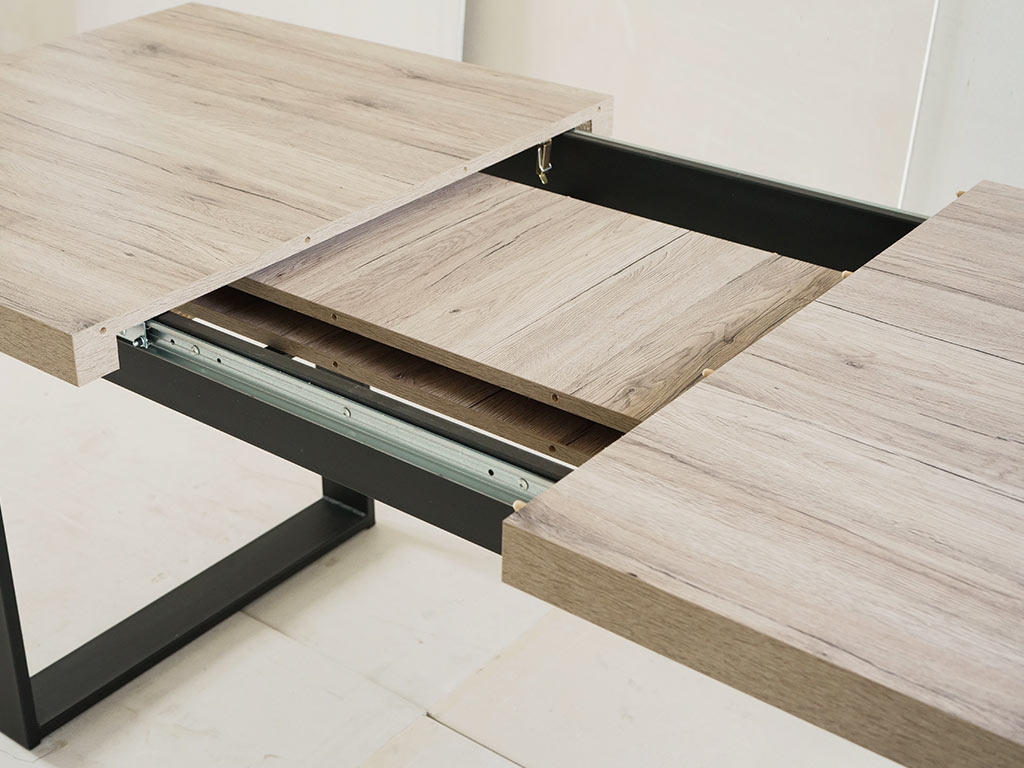 Blat stołu wykonany jest z płyty laminowanej w której są widoczne elementy struktury drewna: słoje i sęki, a jego powierzchnia jest szczotkowana. Całość tworzy ciekawy kontrast, pomiędzy chłodną podstawą i ciepłym kolorem blatu. W naszej ofercie posiadamy ponad 12 kolorów blatu.